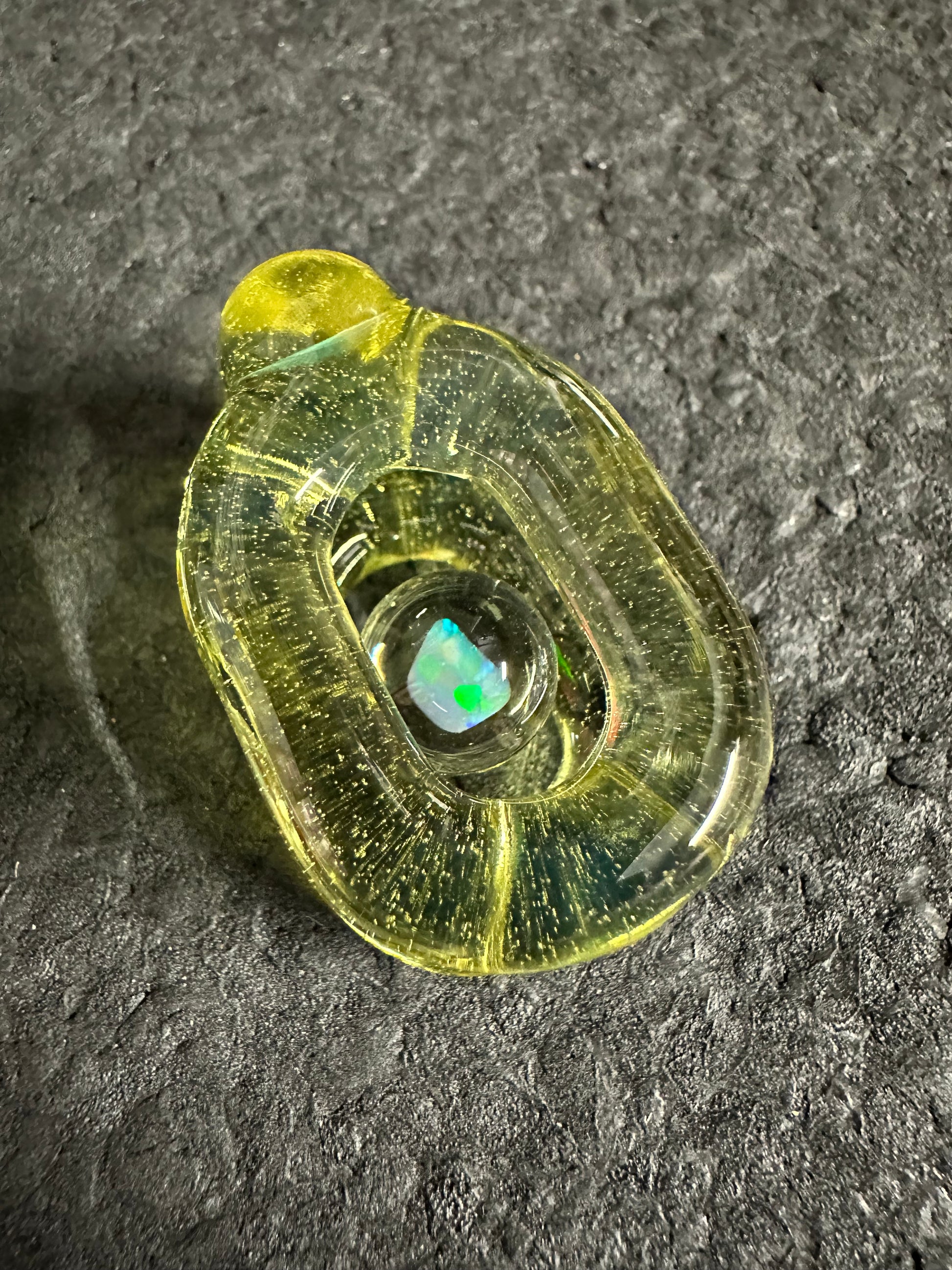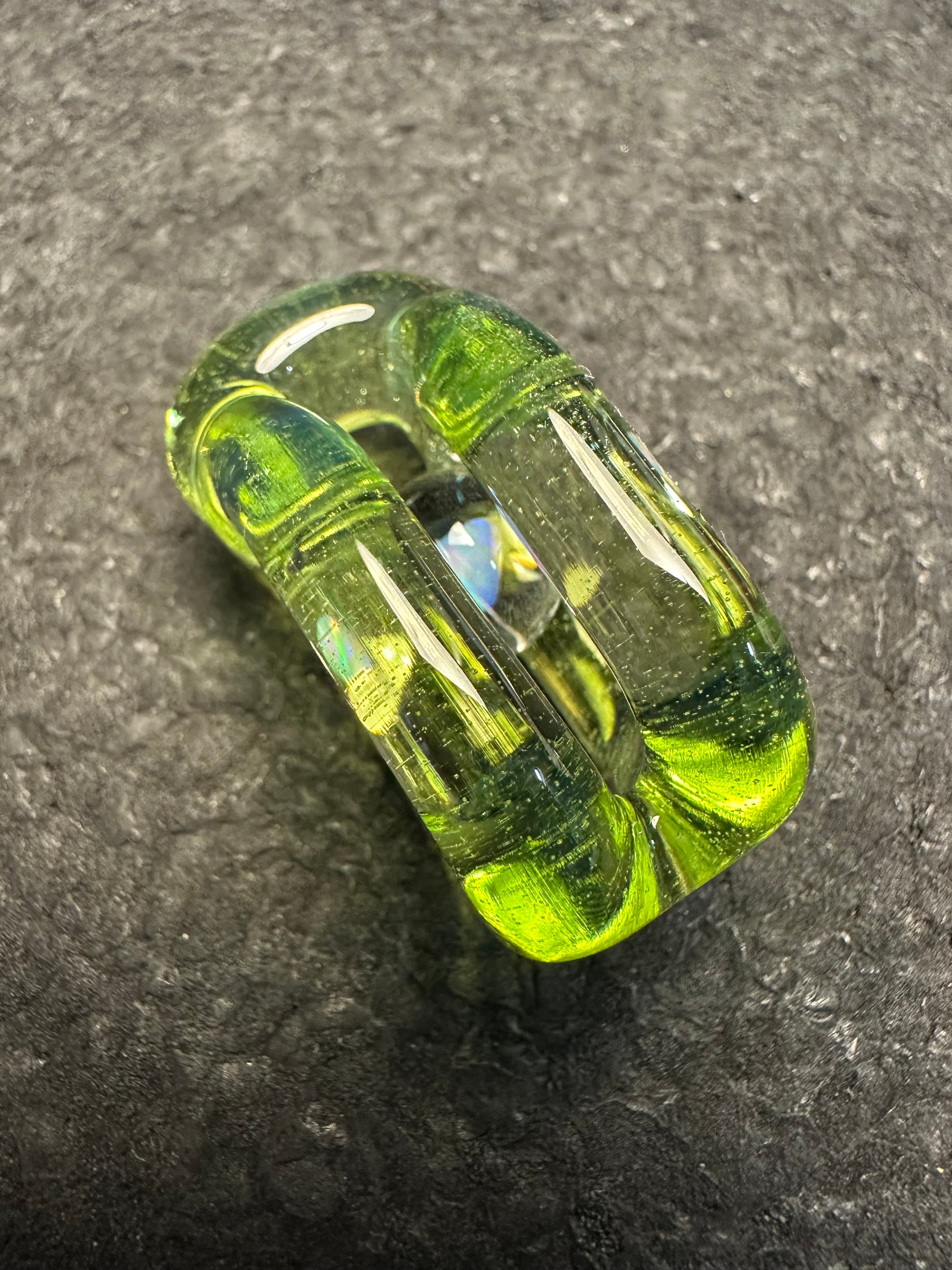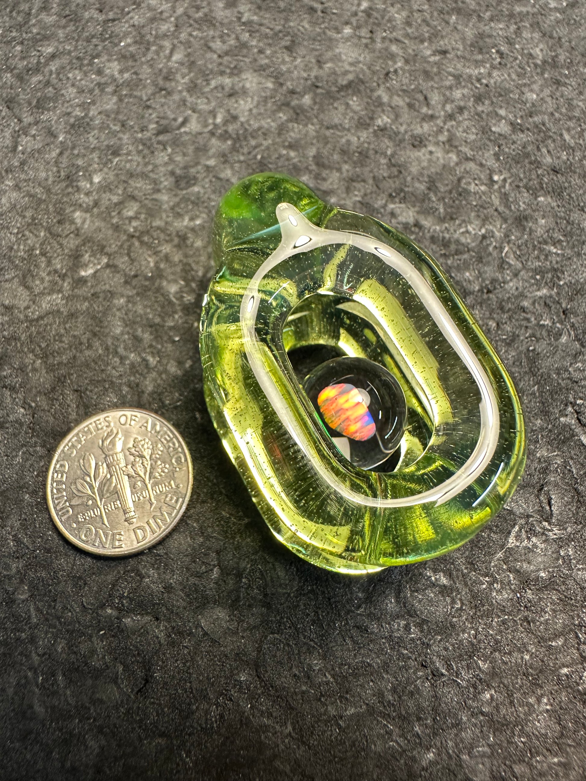 Made with Flip Frog from @borobatch. Fully CFL reactive, it changes colors based on light source, Fluorescent va. LED. About 1.75” tall. Bail opening is 7.16mm.