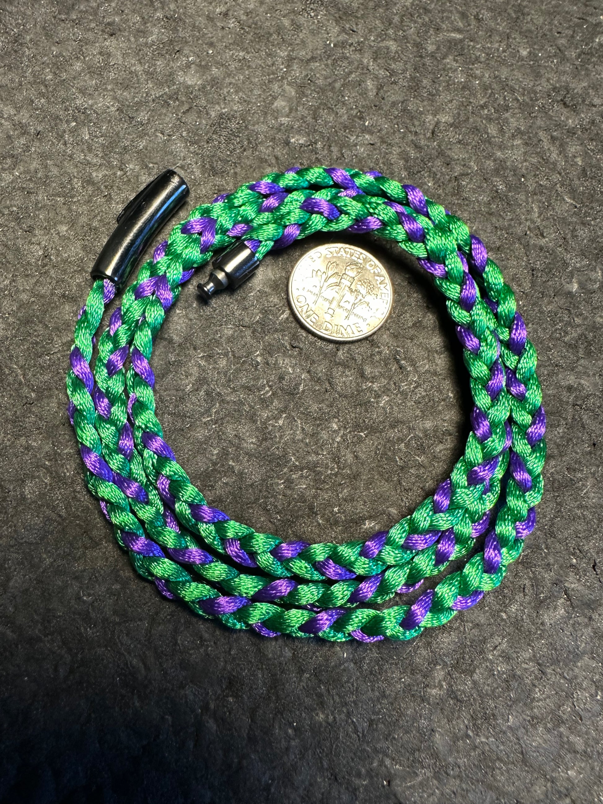 Made with premium quality Rattail Nylon cord. 24” long. Braided by yours truly. Custom sizes and colors available upon request. Clasp will fit through 6mm holes or larger.
