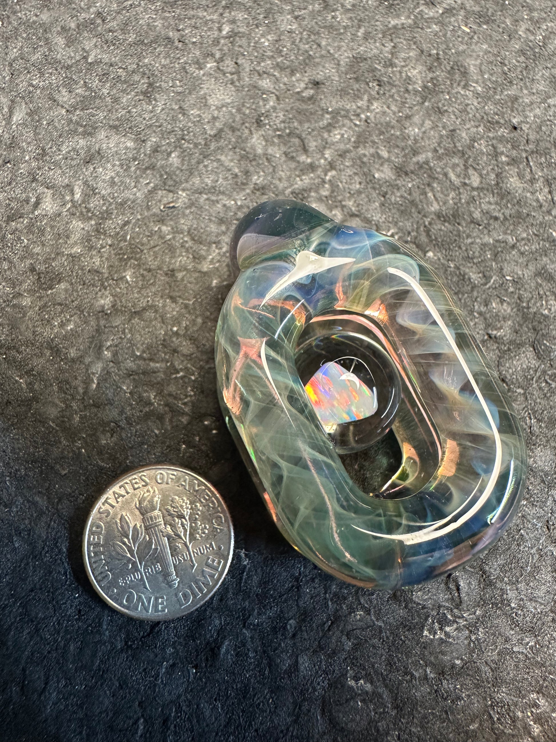 Made with UV reactive Ion from @moltenaura over Cfl reactive Silver Potion from @glassalchemy. Changes colors based on light source. About 1.75” tall. Bail opening is 7.04mm. One of a kind, never to be made again!